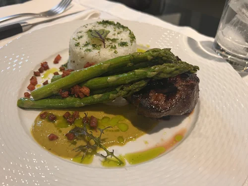 - Zinfandel wine reduction with Dijon, thyme, infused parsley oil - micro carrots and begonia flowers