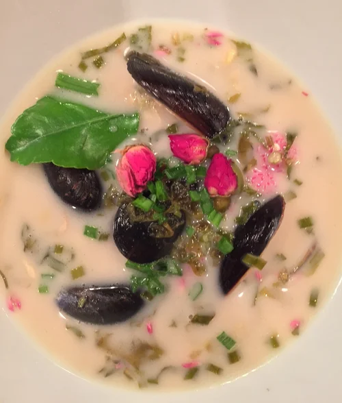 Sea bass - Olive oil poached - Tangerine Dijon sauce with Saffron, infused parsley oil,
