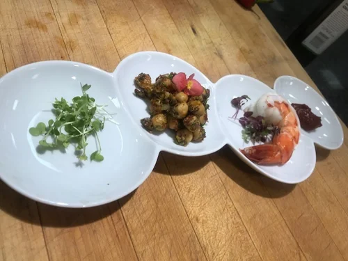 Little app for tonight's private event. Hickory grilled and mesquite smoke finished gulf shrimp on brown bread with herbed French farmers cheese, aioli and chervil