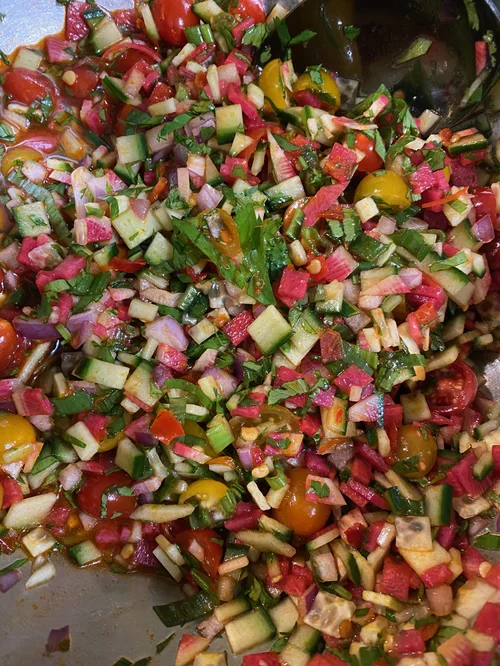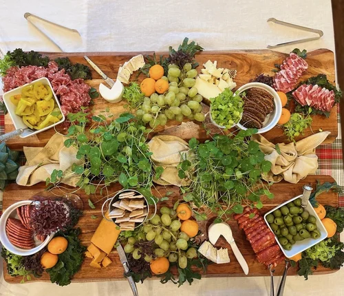 Chefs fish bowl Salad - organic greens & endive, thyme and maple pecans, hand cut carrot flowers, micro cucumbers, edible flowers, micro radish