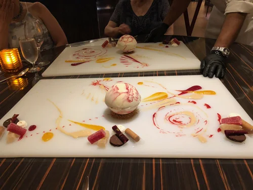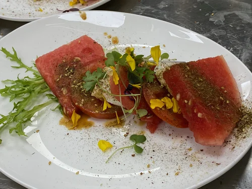 - Zinfandel wine reduction with Dijon, thyme, infused parsley oil - micro carrots and begonia flowers